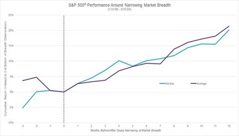 Breadth has narrowed because investors are grappling with the prospect of slower growth, and that has shifted the bid back to those high-quality, wide-moat, mega-cap tech names.