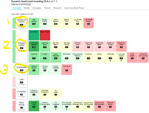 The final point is perhaps the most important. Despite the risks the conflict creates, the weight of the evidence is positive for U.S. stocks. In its latest monthly run. While credit spreads between Hi Yield debt and US Government debt is sure to widen with the intensity of the conflict, bonds become even less attractive. When money flees the equity markets it tends to find a home in what is construed as safety locations- Gold and US Treasuries. The price spikes that these see make them less attractive and the sell-off in equities could eventually present opportunity. Even in the face of extreme volatility, this is what relative strength analysis is showing across the financial universe: