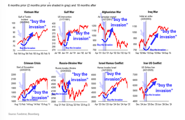 Getting a bit more recent, I took a look at a picture provided by Thomas Lee at FundStrat. This showed the most recent spate of conflicts with an exact picture of each going into the conflict and then coming out. This dovetails with the statistics above that were gathered from S&P Dow Jones Indexes.
