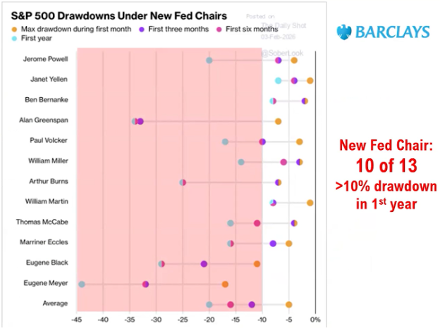 The market hates uncertainty, and a new Fed chair generates additional uncertainty. While the early days of some new Fed chairs have gone smoothly, in other cases, new chairs have faced crises. The average correction of 14.8% during the first six months implies that investors have sold first and asked questions later. Investors have expected a Warsh-led Fed to be dovish, at least when it comes to the fed funds rate early in his term. Assuming he is confirmed in the next few months, a protracted war in the Middle East could delay the next phase of the easing cycle. Once again, here is the action of the past 13 Fed Chair appointments.