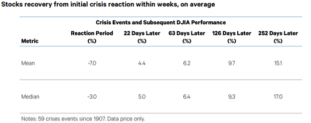 If we take a moment and track all crisis events for decades, I was able to log 59 since 1907. The market has tended to decline during the event itself, by an average of 7.0% and a median of 3.0%. Once the crisis has passed, the market has recovered within a few months, on average. The exceptions have been when a crisis damages the economy, such as the Bear Sterns collapse in 2008 or Arab oil embargo in 1973. Assuming hostilities subside in the coming days or weeks, we would expect the market reaction to be similar to the majority of crisis events.